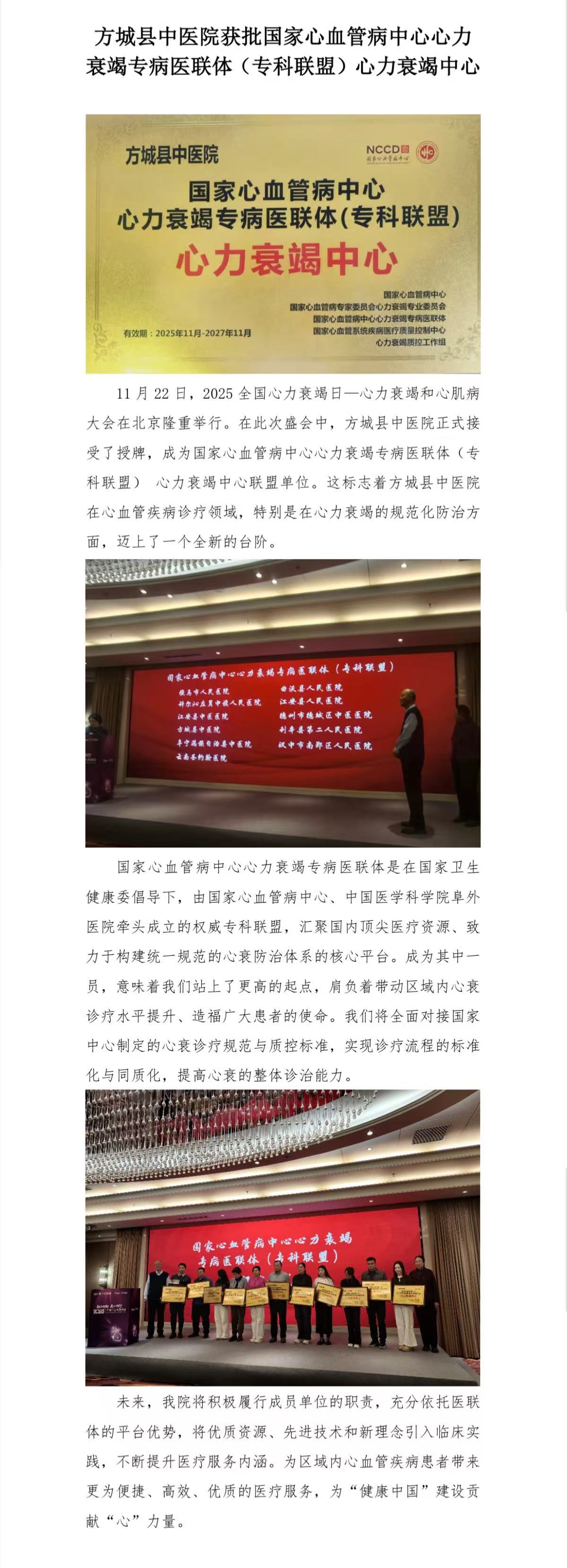 方城县中医院获批国家心血管病中心心力衰竭专病医联体(专科联盟)心力衰竭中心
